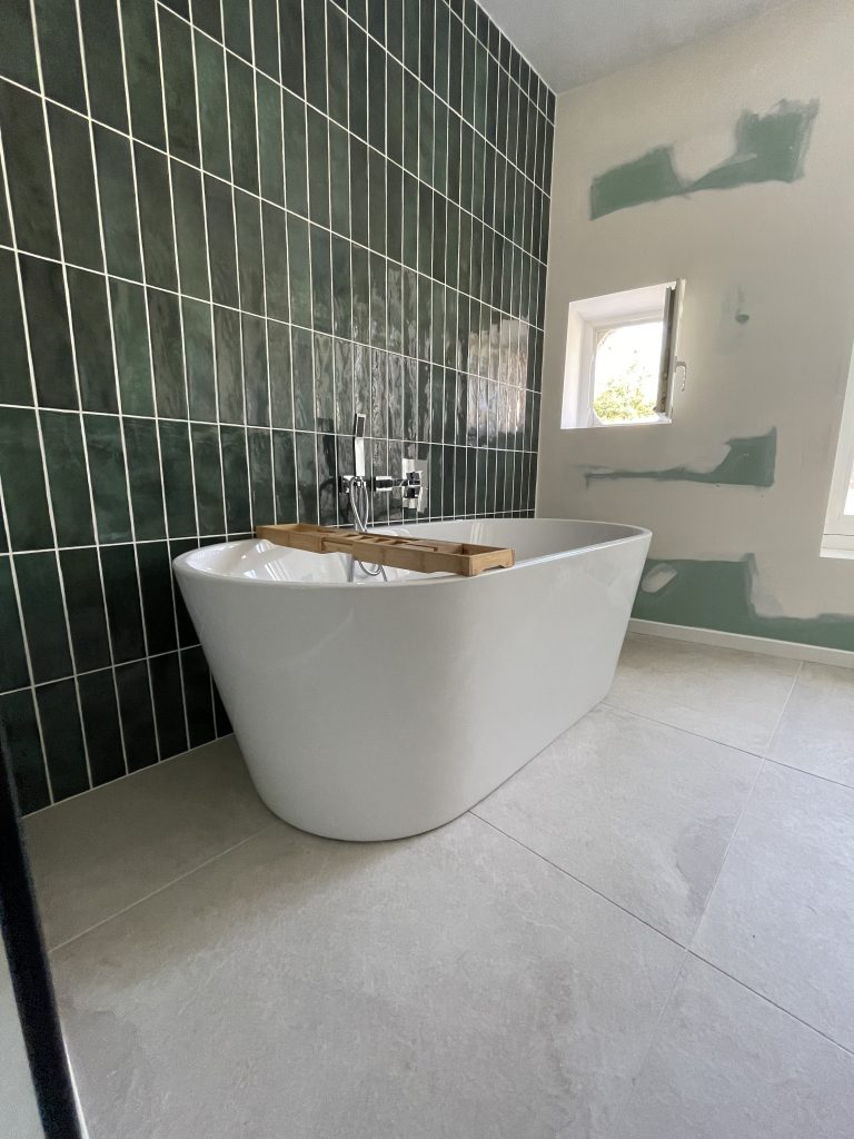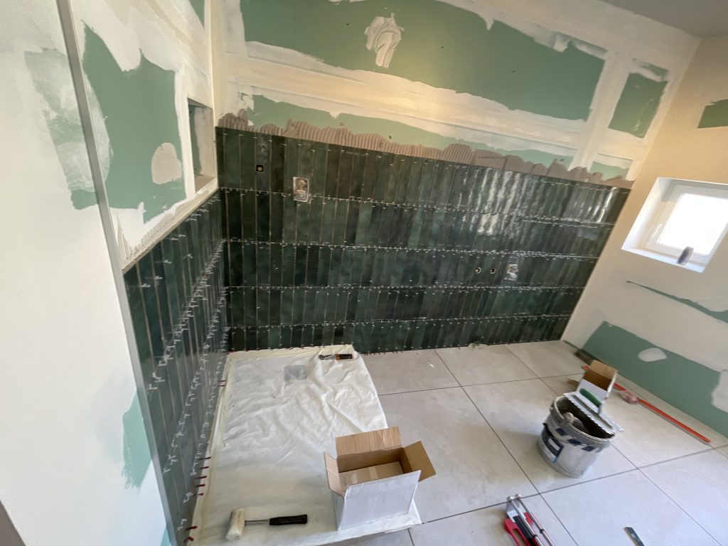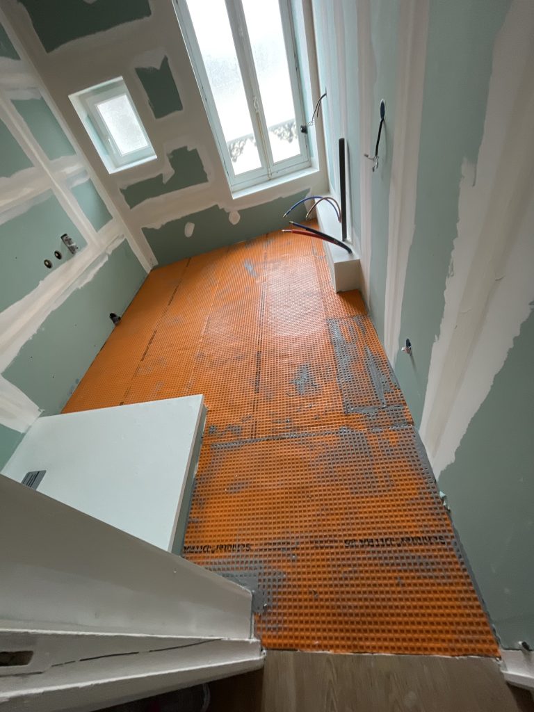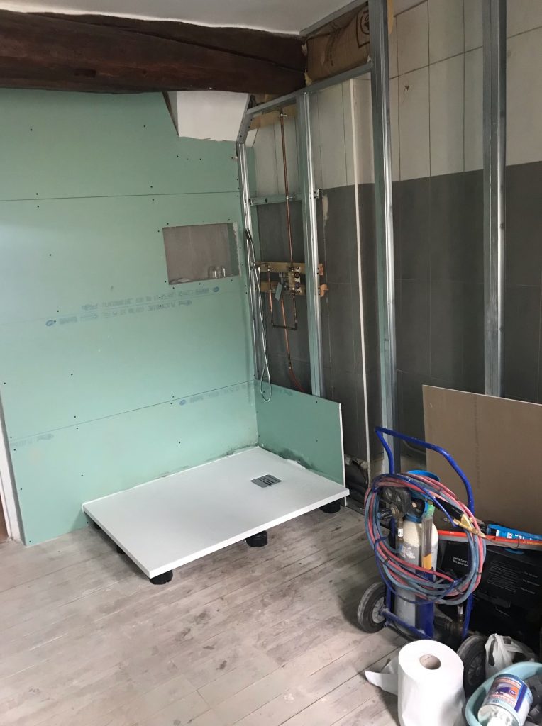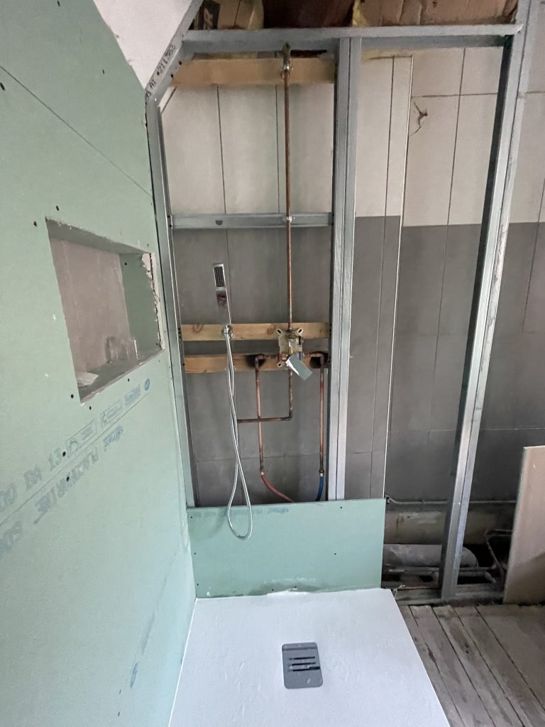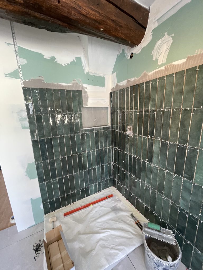 La première phase a consisté à déposer l’ancienne salle de bain. Cela a permis de revoir entièrement les circuits d’alimentation et d’évacuation des eaux. Une fois cette étape réalisée, notre équipe a posé du placo hydrofuge, spécialement conçu pour résister à l’humidité, avant d’appliquer un enduit de finition. Ces travaux préparatoires assurent une base solide pour les étapes suivantes.