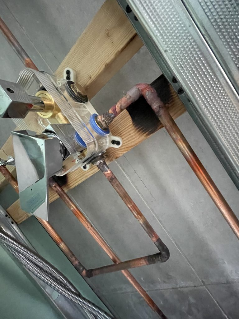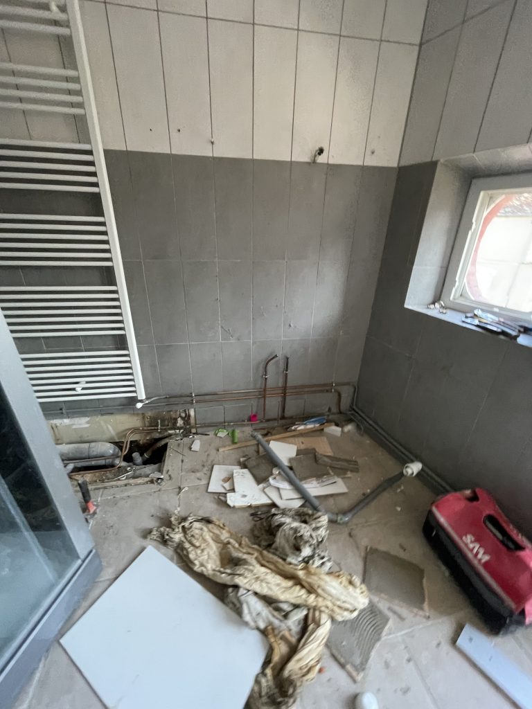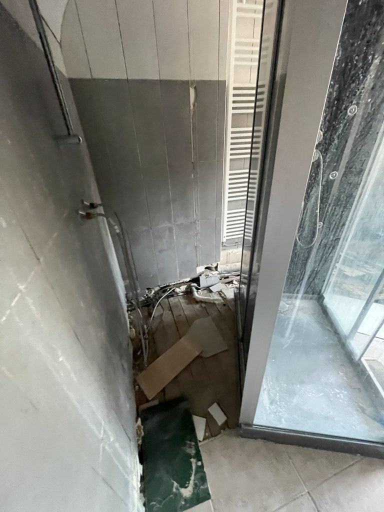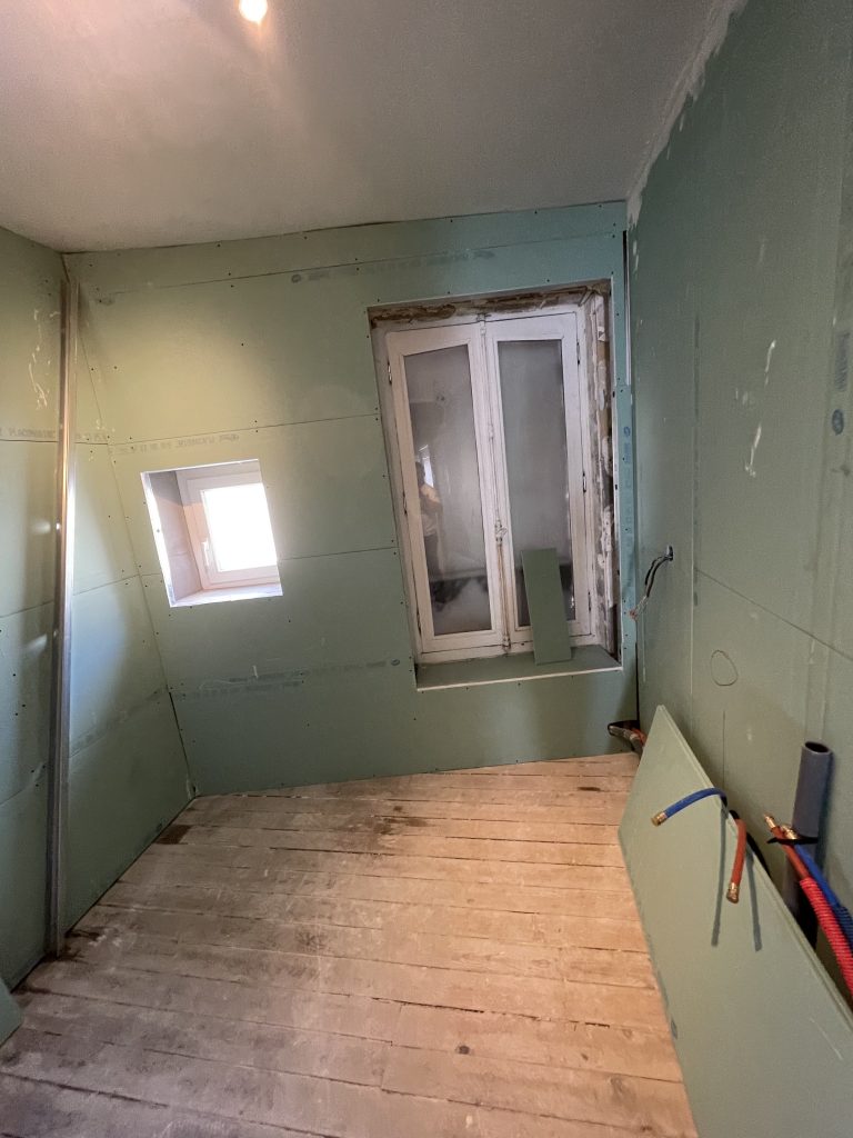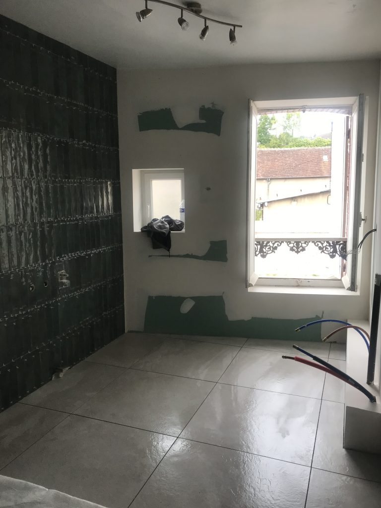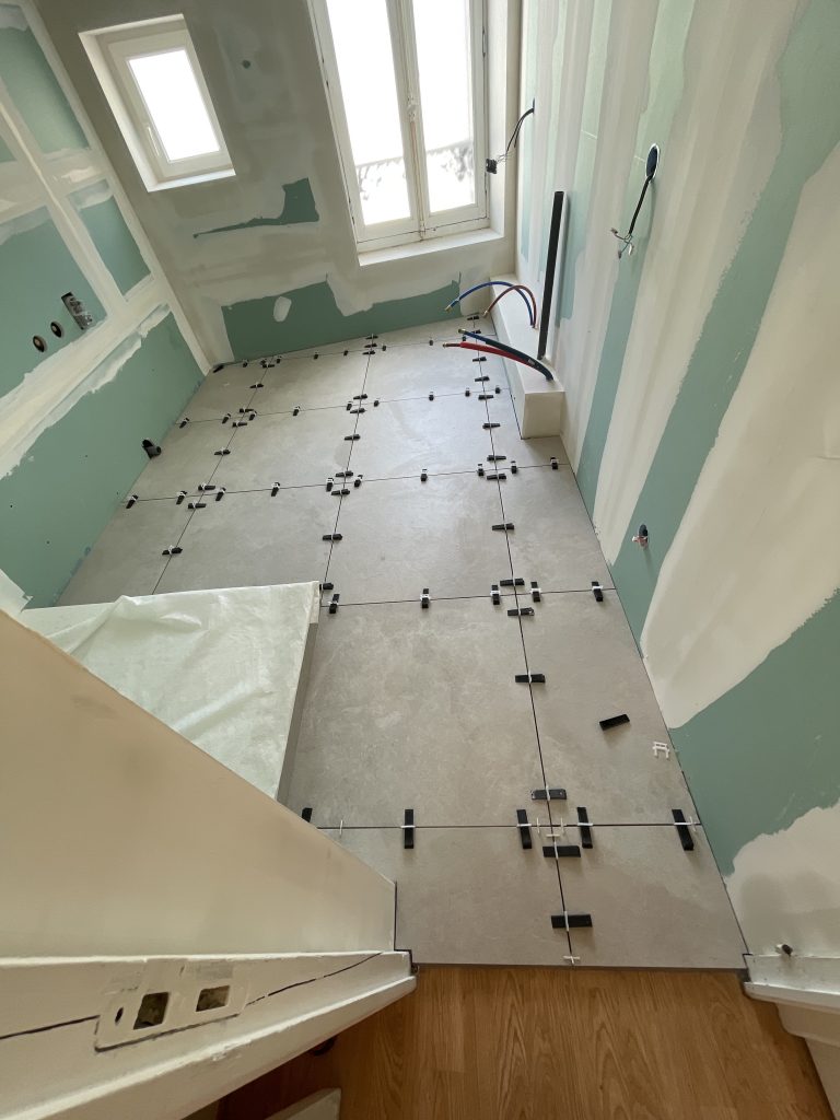 La première phase a consisté à déposer l’ancienne salle de bain. Cela a permis de revoir entièrement les circuits d’alimentation et d’évacuation des eaux. Une fois cette étape réalisée, notre équipe a posé du placo hydrofuge, spécialement conçu pour résister à l’humidité, avant d’appliquer un enduit de finition. Ces travaux préparatoires assurent une base solide pour les étapes suivantes.