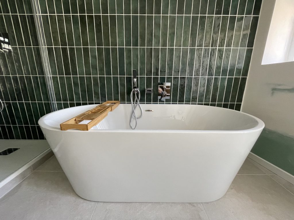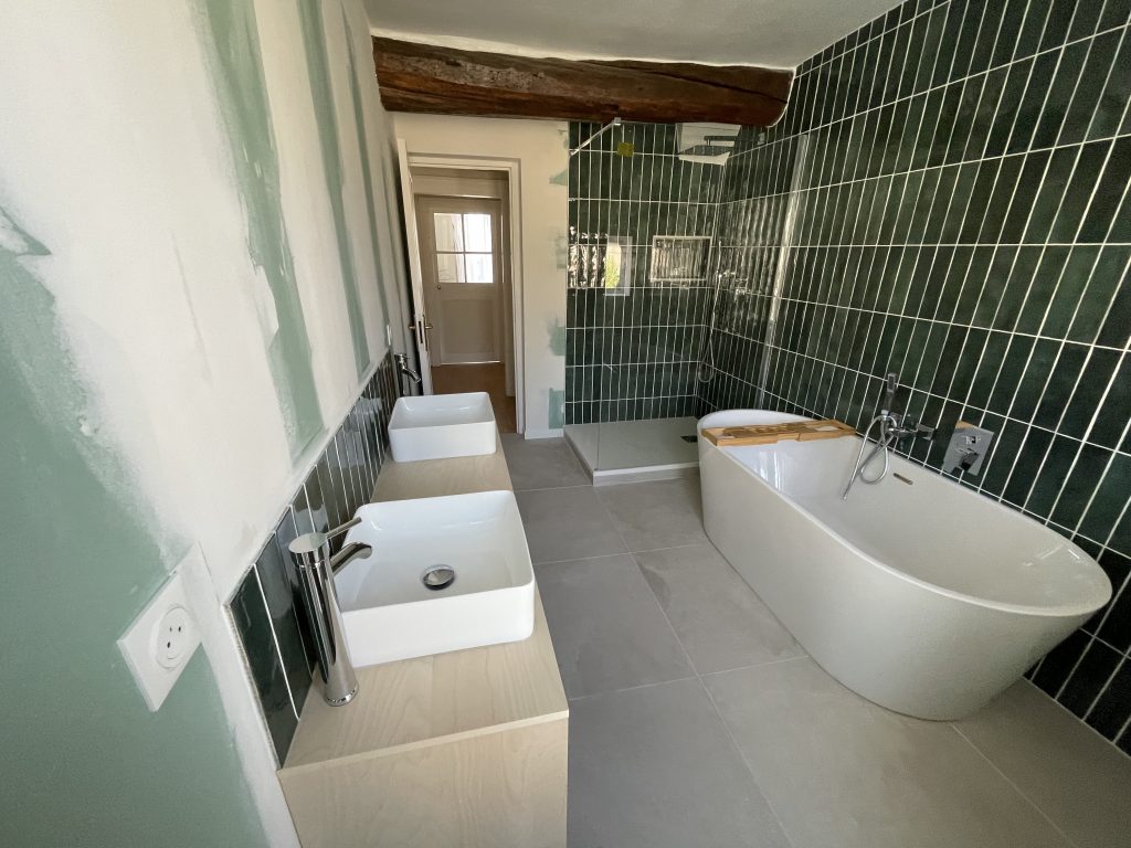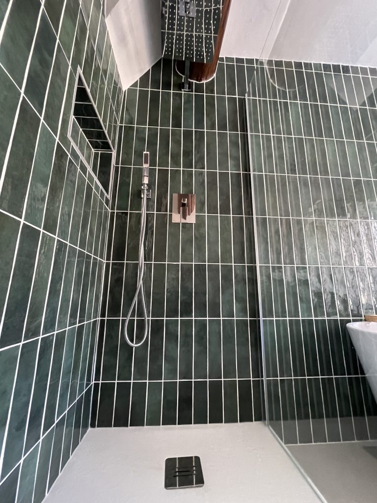 Une fois la préparation terminée, place aux équipements. La salle de bain a été équipée d’une colonne de douche moderne, d’une baignoire élégante, de parois vitrées et d’un receveur de douche robuste. La robinetterie, choisie pour sa qualité et son design, a été installée avec précision. Chaque élément a été pensé pour s’intégrer harmonieusement dans l’esprit Zen recherché par le client.
