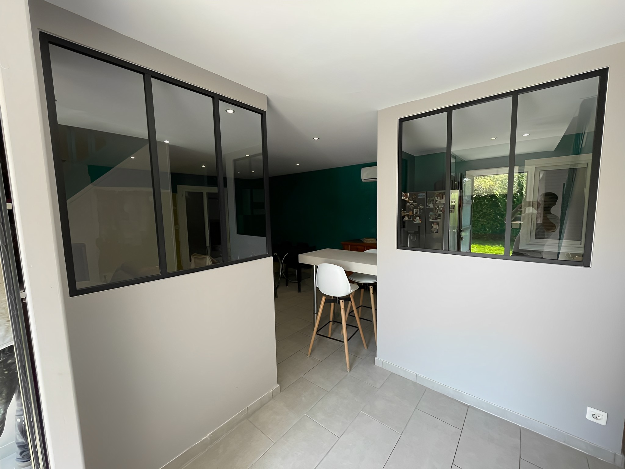 Harmonisation de vos aménagements : Nous avons réalisé la pose d’une verrière d’atelier pour la séparation d’une cuisine et d’un Salon Salle à manger. Le rendu après la démolition et après la pose de la verrière est impressionnant.